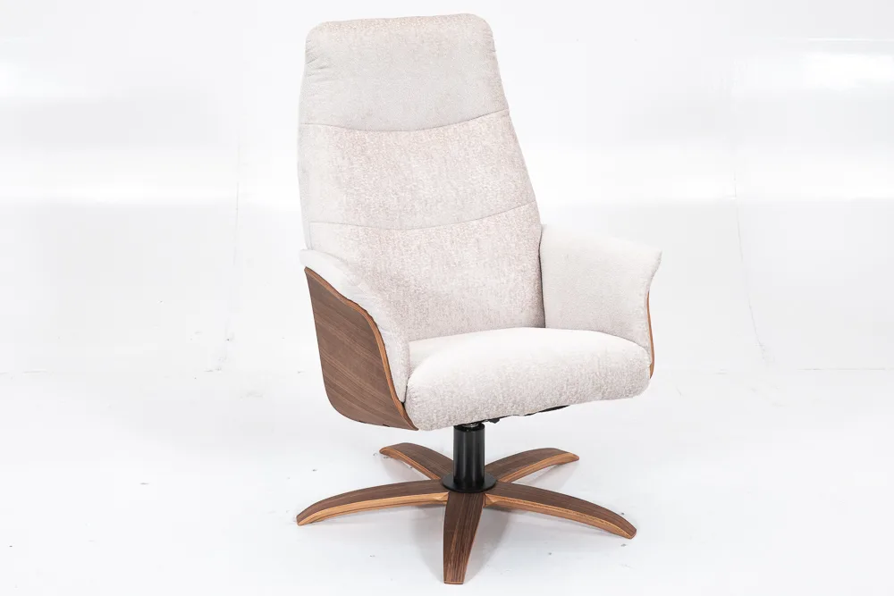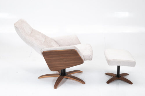 Fauteuil pivotant, style scandinave, dossier haut, repose-pieds inclus.